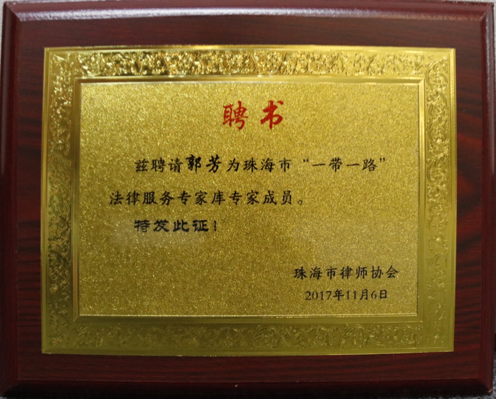 珠海市“一带一路法律服务专家库”由66名来自全国各地的律师精英、法律专家组成,既有仲裁和商事调解方面的专家、大学教授,又有全国知名律师事务所合伙人,很多律师同时还是全国涉外律师领军人才库成员。此次一带一路法律服务专家库成员聘期为三年,专家库实行动态管理,一般每三年更新一次。作为专家库成员,郭芳律师将以丰富的涉外法律服务经验,扎实的法律专业知识,为法律服务“一带一路”建设做出最大的贡献。