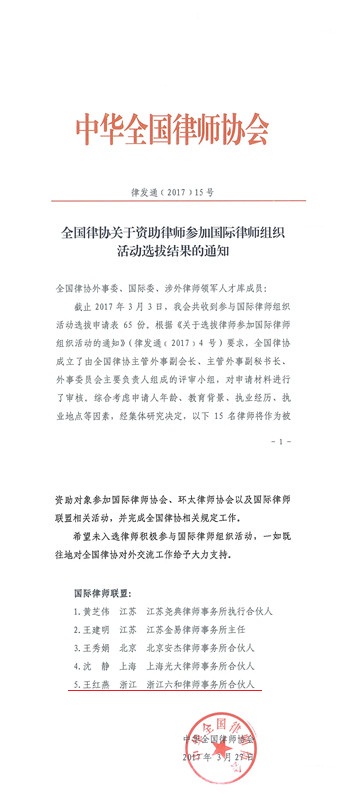 近日,全国律协印发《关于资助律师参加国际律师组织活动选拔结果的通知》,共有15名律师将作为被资助对象参加国际律师协会、环太律师协会及国际律师联盟相关活动,六和所高级合伙人王红燕律师通过选拔,将参加国际律师联盟组织的相关活动。