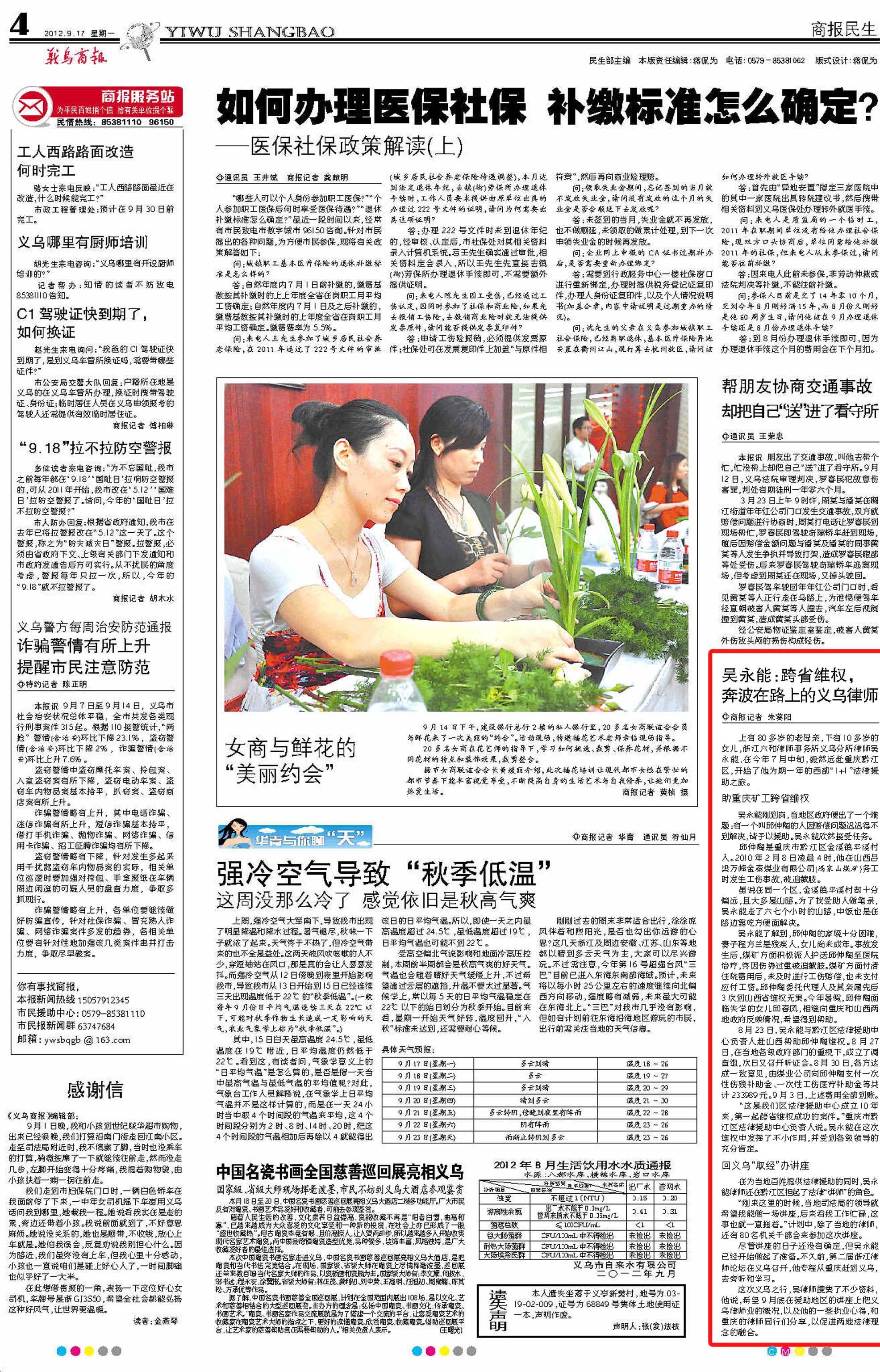 2012年9月17日,《义乌商报》第四版《吴永能:跨省维权,奔波在路上的义乌律师》一文,报道了本所“1+1”中国法律援助律师吴永能帮助重庆矿工跨省维权以及在重庆黔江区为当地百姓举办法律讲座的事迹。