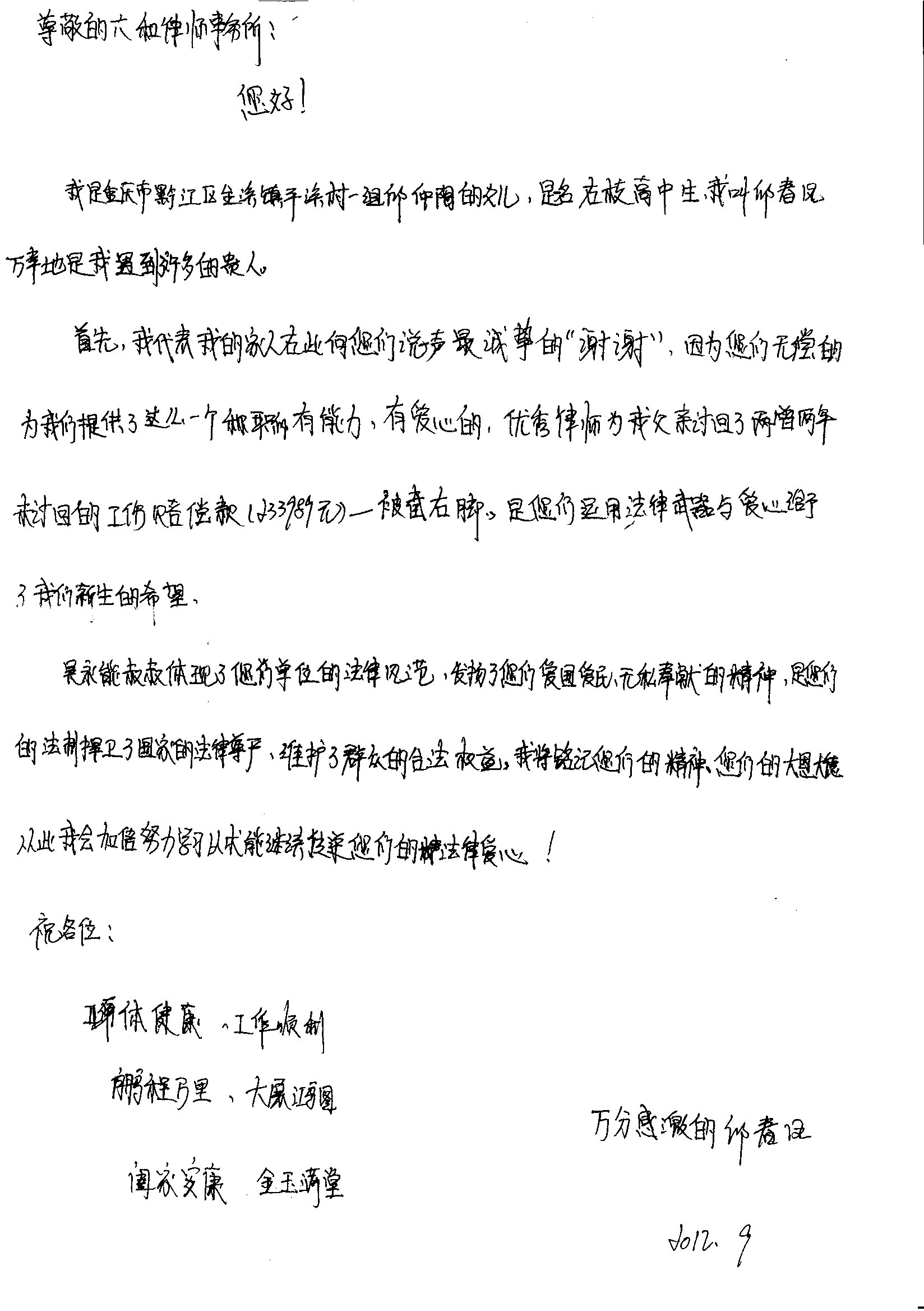 近日,本所收到一封来自重庆市黔江区金溪镇平溪村村民邱仲陶一家的感谢信,向本所参加“1+1”中国法律援助行动的吴永能律师表达最诚挚的谢意!