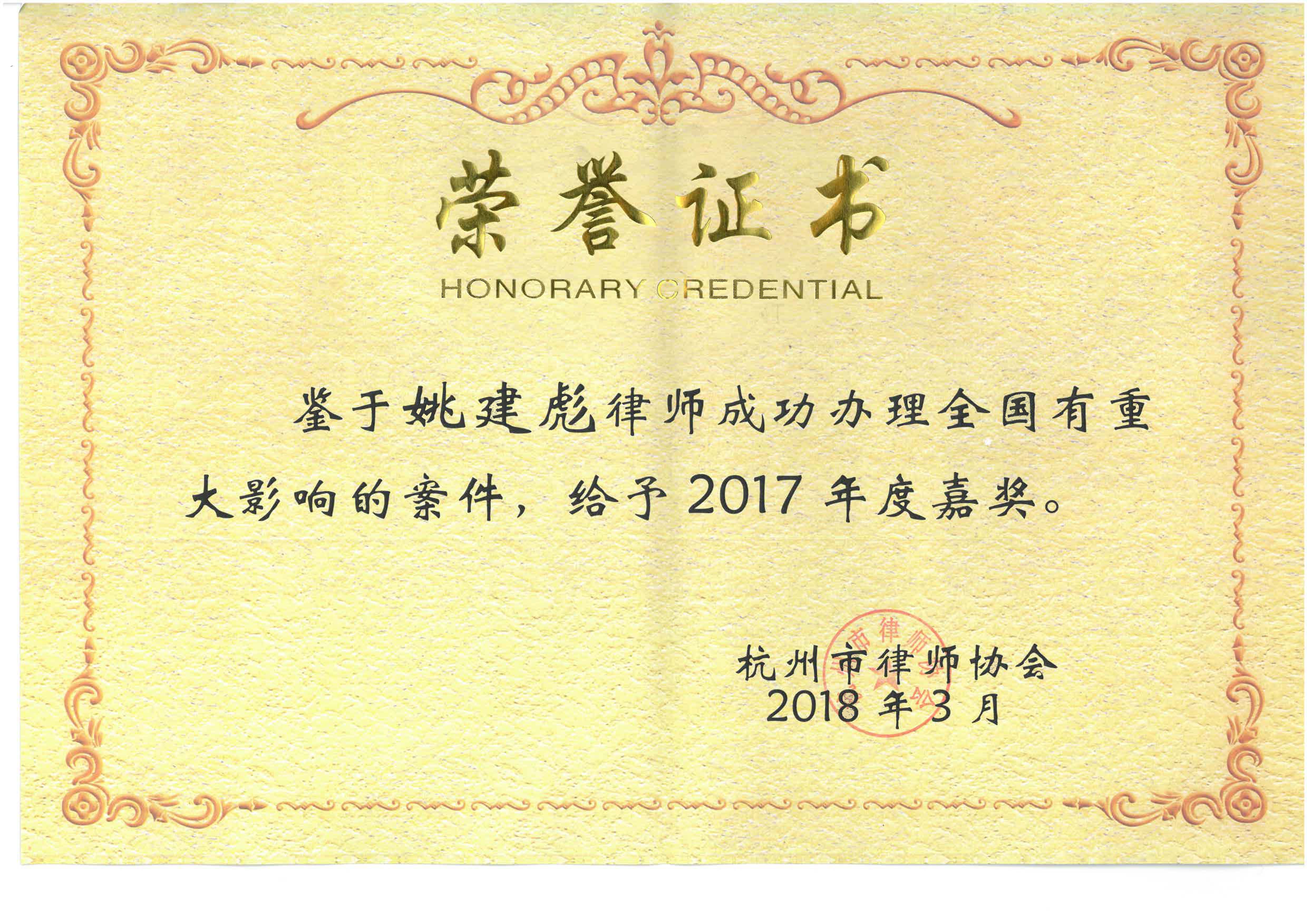 姚建彪律师因成功办理全国有重大影响的案件,荣获市律协2017年度嘉奖。