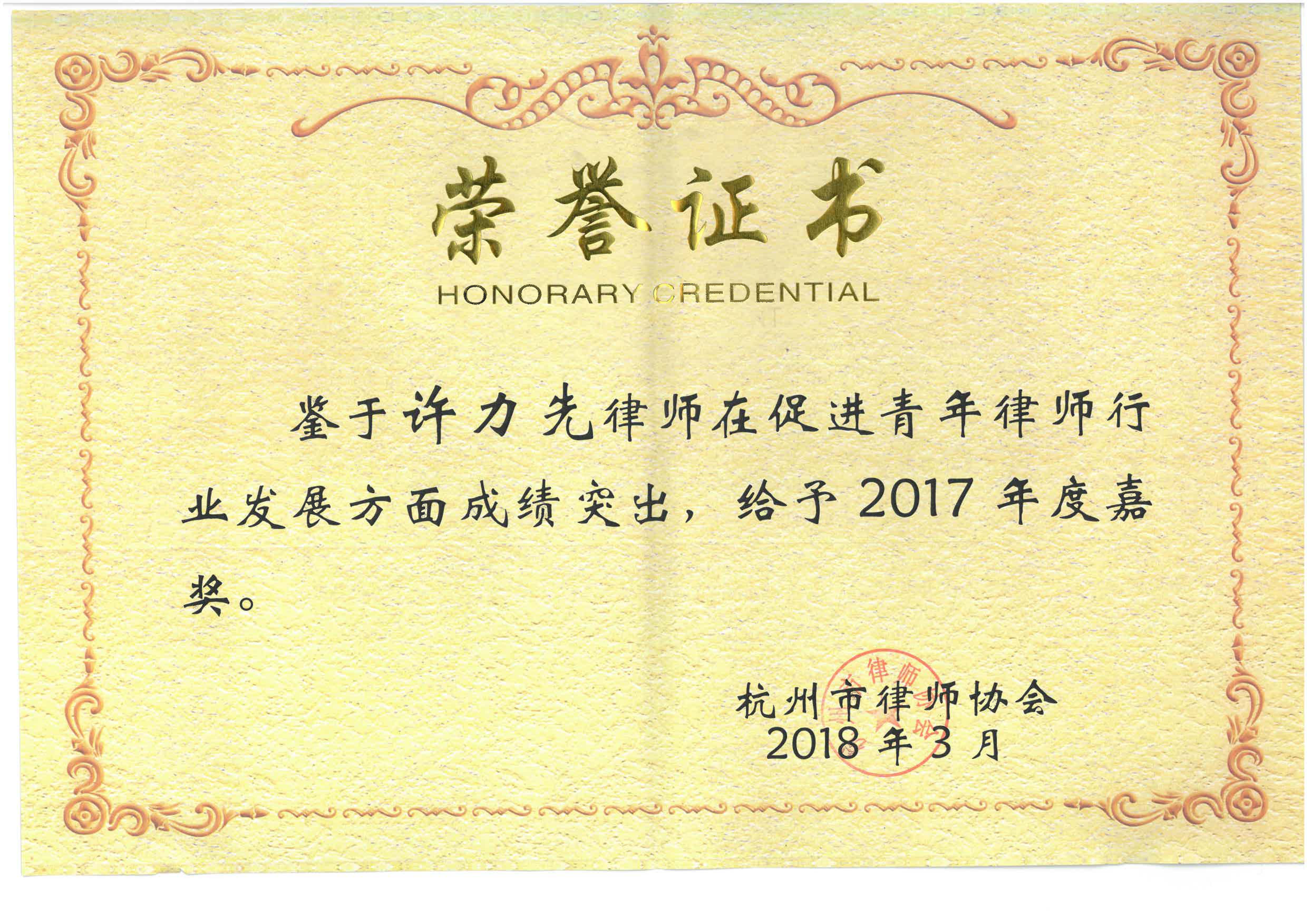 许力先律师因在促进青年律师行业发展方面成绩突出,荣获市律协2017年度嘉奖。