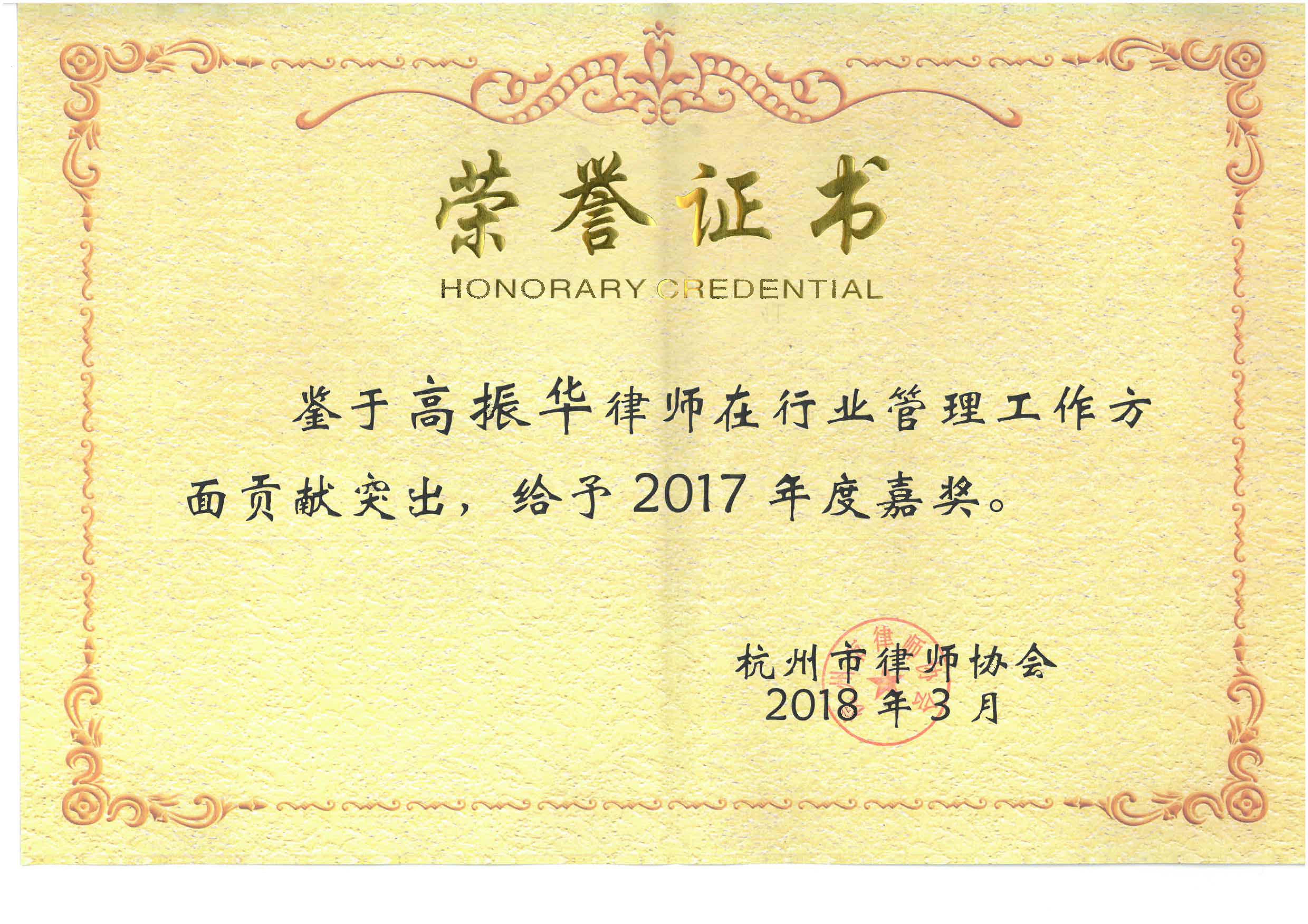 高振华律师因在行业管理工作方面贡献突出,荣获市律协2017年度嘉奖。